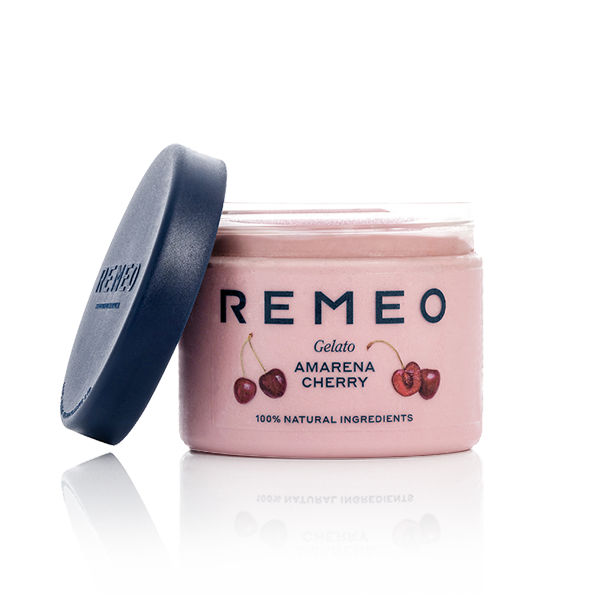 Remeo Amarena Cherry Gelato uses only the highest quality, natural ingredients, the unique tasting Amarena cherry is both sweet and slightly tart making it the perfect addition to the Remeo gelato range. The sweet and sour taste is both elegant and creamy with every spoonful bursting with flavour and the colour hits you making your mouth water in anticipation. The perfect combination. The cherries are grown and picked in Italy ensuring Remeo maintain that authentic experience consumers love and trust. Using only 100% natural, premium ingredients carefully sourced, Remeo takes its gelato seriously. Tipping the balance from cream to high-quality Italian milk the results are lighter and creamier and lower in fat than traditional ice cream.